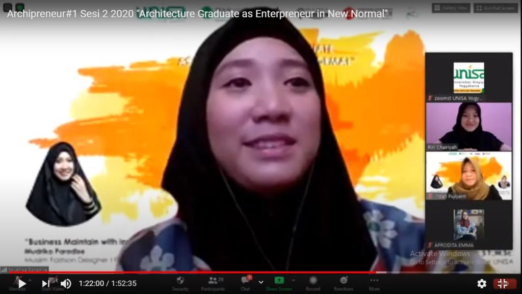Kaprodi Arsitektur Unisa Yogya Aprodita Emma Yetti, S.T., M.Sc mengatakan bahwa kegitan ini bertujuan untuk menyemangati calon atau lulusan arsitektur dalam berwirausaha di masa new normal sekarang.