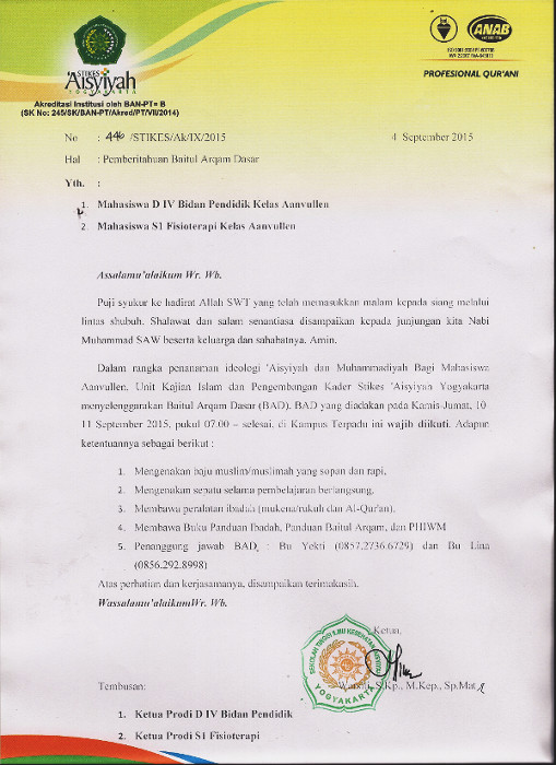 Dalam rangka penanaman ideologi ‘Aisyiyah dan Muhammadiyah bagi Mahasiswa Aanvullen, Unit Kajian Islam dan Pengembangan Kader STIKES ‘Aisyiyah Yogyakarta (SAY) menyelenggarakan Baitul Arqam Dasar (BAD).