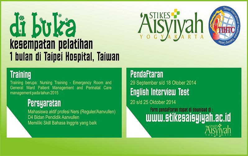 STIKES ‘Aisyiyah Yogyakarta bekerjasama dengan Taiwan International Healthcare Training Center (TIHTC) membuka kesempatan kepada mahasiswa untuk mengikuti pelatihan selama 1 bulan di Taipei Hospital, Taiwan, R.O.C berupa: Nursing Training – Emergency Room and General Ward Patient Management and Perinatal Care management pada tahun 2015. Pelatihan ini akan dilaksanakan selama 3 periode yaitu Maret-April-Mei 2015. Adapun persyaratan sebagai berikut: