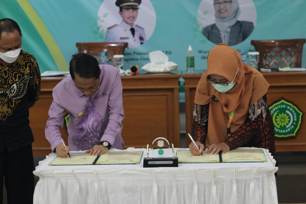 Penandatanganan MoU terkait bidang Catur Dharma Perguruan Tinggi, Implementasi Program Merdeka Belajar Kampus Merdeka dan dukungan Pemerintah Daerah Kabupaten Gorontalo terkait pembukaan Fakultas Kedokteran UNISA Yogyakarta.