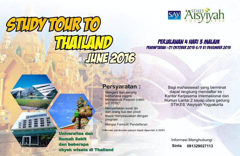 Dibuka perjalanan Study Tour To Thailand di bulan Juni 2016. silahkan melalukan pendaftaran ke Kantor Kerjasama Internasional dan Humas SAY. dapat menghubungi: