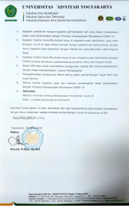 Untuk mengantisipasi penyebaran COVID 19, Universitas ‘Aisyiyah Yogyakarta mengoptimalkan pembelajaran e-learning. Hal tersebut berdasarkan Surat Edaran Rektor No. 286/UNISA/AU/III/2020, Tentang Kewaspadaan Penyebaran COVID-19, tanggal 14 Maret 2020, yang ditandatangani Rektor UNISA, Warsiti, S.Kp., M.Kep., Sp.Mat.