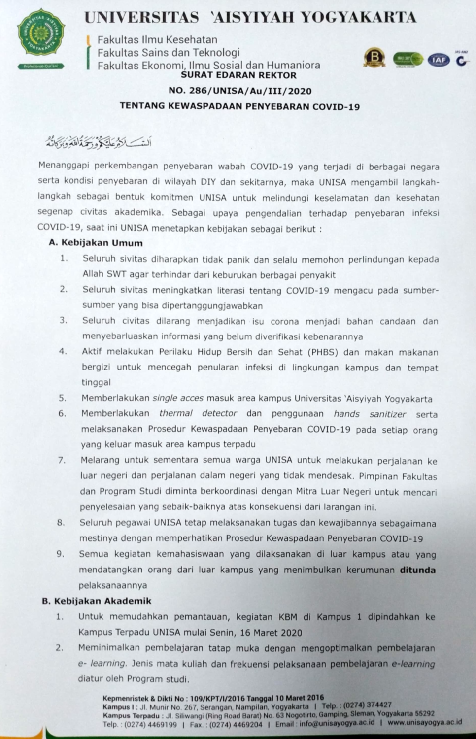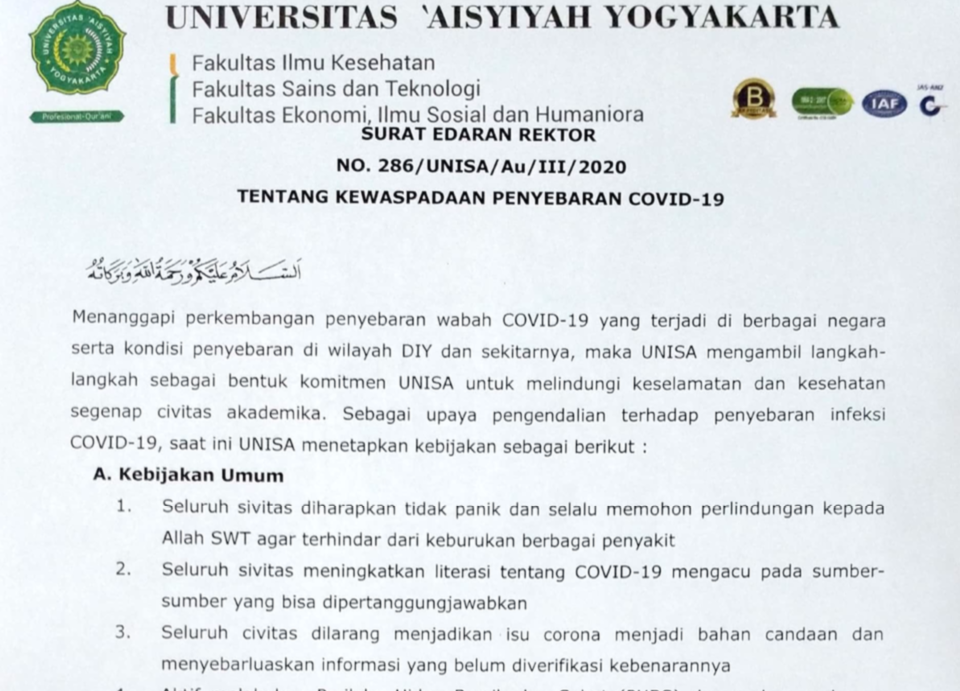 Untuk mengantisipasi penyebaran COVID 19, Universitas ‘Aisyiyah Yogyakarta mengoptimalkan pembelajaran e-learning. Hal tersebut berdasarkan Surat Edaran Rektor No. 286/UNISA/AU/III/2020, Tentang Kewaspadaan Penyebaran COVID-19, tanggal 14 Maret 2020, yang ditandatangani Rektor UNISA, Warsiti, S.Kp., M.Kep., Sp.Mat.
