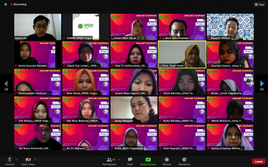 Universitas ‘Aisyiyah (UNISA) Yogyakarta gelar hari pertama Online Courses, Senin (22/02). Menghadirkan 3 Universitas dari mancanegara, yaitu University of Leeds (Inggris), Nagasaki University (Jepang), dan Taiwan International Healthcare Training Center (TIHTC)(Taiwan). Online Courses akan dilaksanakan selama 3 hari, 22, 24, dan 26 Februari 2021.