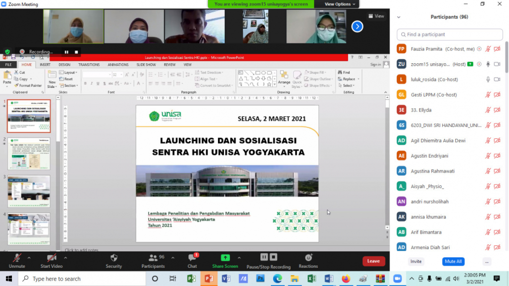 Lembaga Penelitian dan Pengabdian Masyarakat (LPPM) UNISA Yogyakarta luncurkan Sentra Hak Kekayaan Intelektual (HKI) secara daring (2/3). Sentra HKI UNISA Yogyakarta diresmikan secara langsung oleh Taufiqurrahman, Ph.D, Wakil Rektor I Bidang Akademik dan Kerjasama. Dalam sambutannya, WR I berharap kehadiran Sentra HKI ini dapat berkontribusi signifikan dalam mendukung reputasi UNISA Yogyakarta.