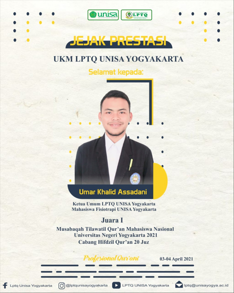 Unit kegiatan Lembaga pengembangan Tilawatil Qur’an (LPTQ) Universitas aisyiyah yogyakarta berhasil meraih prestasi pada ajang Musabaqah Tilawatil Qur`an (MTQ) Mahasiswa Nasional 2021 yang selenggarakan oleh Universitas Negeri Yogyakarta (3 – 4 April), mahasiswa Unisa Yk meraih prestasi di 3 kategori yang berbeda.