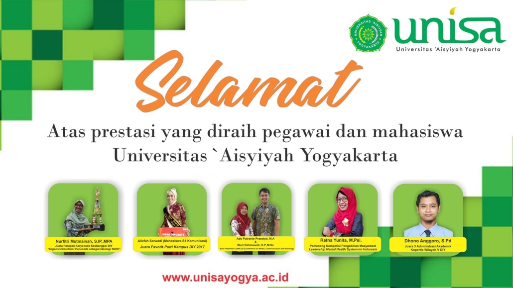 Empat (4) Pegawai dan satu(1) mahasiswa Universitas ‘Aisyiyah (UNISA) Yogyakarta, berhasil meraih prestasi di bulan September ini. Pegawai dari unsur dosen yaitu Nurfitri Mutmainah, SIP., MPA (juara harapan karya tulis KESBANGPOL DIY 2017), Ade Putranto Prasetyo, MA dan Wuri Rahmawati, SP., M.Sc ( Best speaker COMICOS 2017) dan Ratna Yunita, M.Psi ( Pemenang kompetisi pengabdian masyarakat Leadership Mental Health System Indonesia 2017).