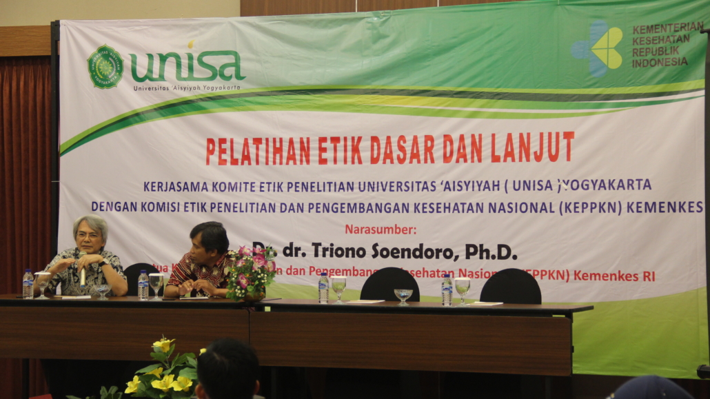 Universitas Aisyiyah Yogyakarta (UNISA) melalui Komite Etik Penelitian bekerjasama dengan Komisi Etik Penelitian dan Pengembangan Kesehatan Nasional (KEPPKN) KEMENKES RI mengadakan Pelatihan Etik Dasar dan Lanjut. Pelatihan yang diselenggarakan oleh Lembaga Penelitian dan Pengabdian Masyarakat (LPPM) ini dilaksanakan selama 3 hari, mulai Senin 18 – 20 Desember 2017 di Hotel Tara Yogyakarta.