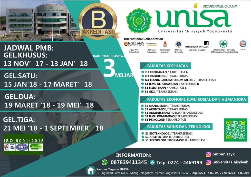 Kabar gembira bagi kalian siswa SMA yang akan lulus tahun 2018, kalian bisa menggunakan nilai raport kalian dari semester 1-5, minimal 75 untuk bisa menjadi mahasiswa UNISA YOGYA, TANPA TES LAGI!