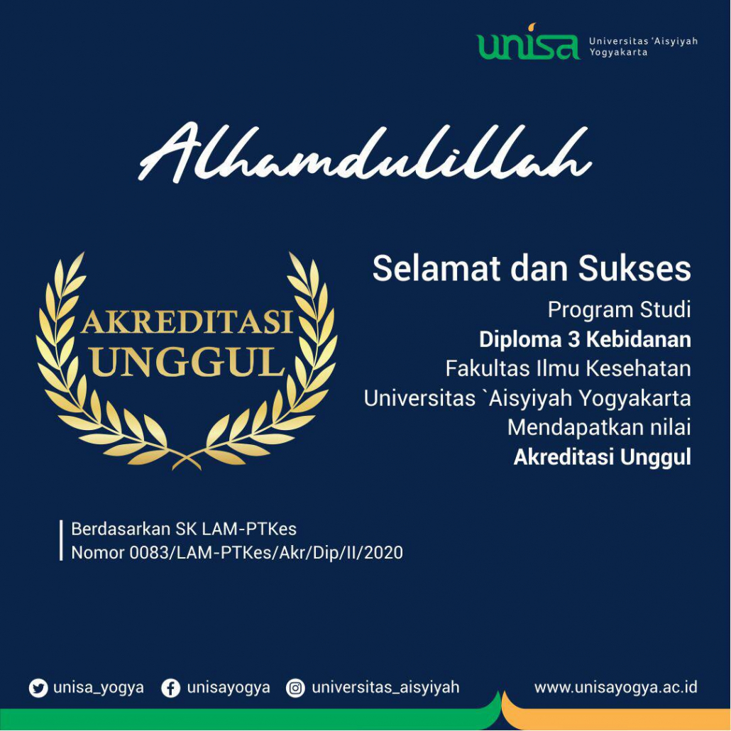 Program Studi Kebidanan D3 Universitas ‘Aisyiyah Yogyakarta (UNISA) meraih akreditasi unggul dari Lembaga Akreditasi Mandiri Perguruan Tinggi Kesehatan (LAM-PTKes) 2020. Unisa yang berusia 4 tahun sejak perubahan bentuk menjadi Universitas telah mencapai prestasi yang memuaskan, antara lain 14 program studi baru sudah meraih akreditasi B dari Badan Akreditasi Nasional Perguruan Tinggi (BAN PT) dan LAM-PTKes. Hasil ini merupakan target dari UNISA untuk meningkatkan Akreditasi Institusi Perguruan Tinggi.