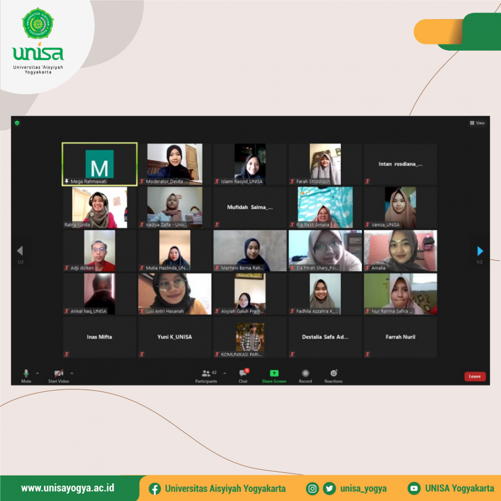Program Studi Psikologi Universitas ‘Aisyiyah (Unisa) Yogyakarta menyelenggarakan workshop dengan tema “Sukses Menulis Artikel Dan Buku”. Kegiatan ini dilaksanakan via aplikasi Zoom Meeting , Kamis (12/03). Peserta workshop hanya dibatasi sebanyak 50 orang untuk efektifitas karena adanya Rencana Tindak Lanjut (RTL) yang harus dilaksanakan.