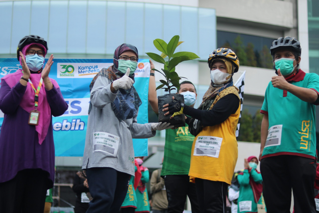 “Dengan kita bersepeda akan membuat jiwa dan pikiran kita sehat, serta tujuan dari penanaman pohon ini untuk mewujudkan Green Campus dalam melestarikan lingkungan,” ucap Warsiti.