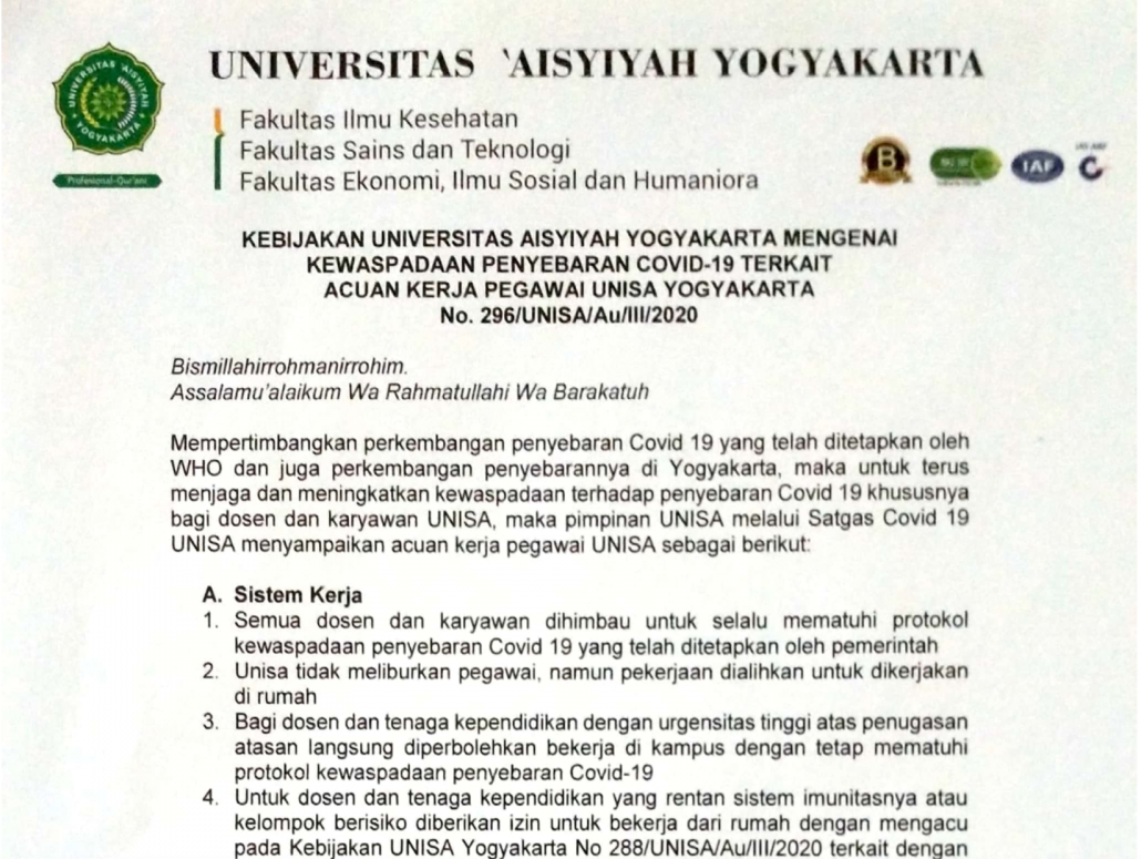 Universitas ‘Aisyiyah Yogyakarta (UNISA) terus mengambil langkah cepat dalam mengantisipasi penyebaran dan penanganan Covid-19. Hari ini, Selasa (17/3) Rektor UNISA, Warsiti, S.Kp.,M.Kep.,Sp.Mat., menerbitkan Kebijakan Terkait Acuan Kerja Pegawai UNISA, No. 296/UNISA/Au/III/2020.