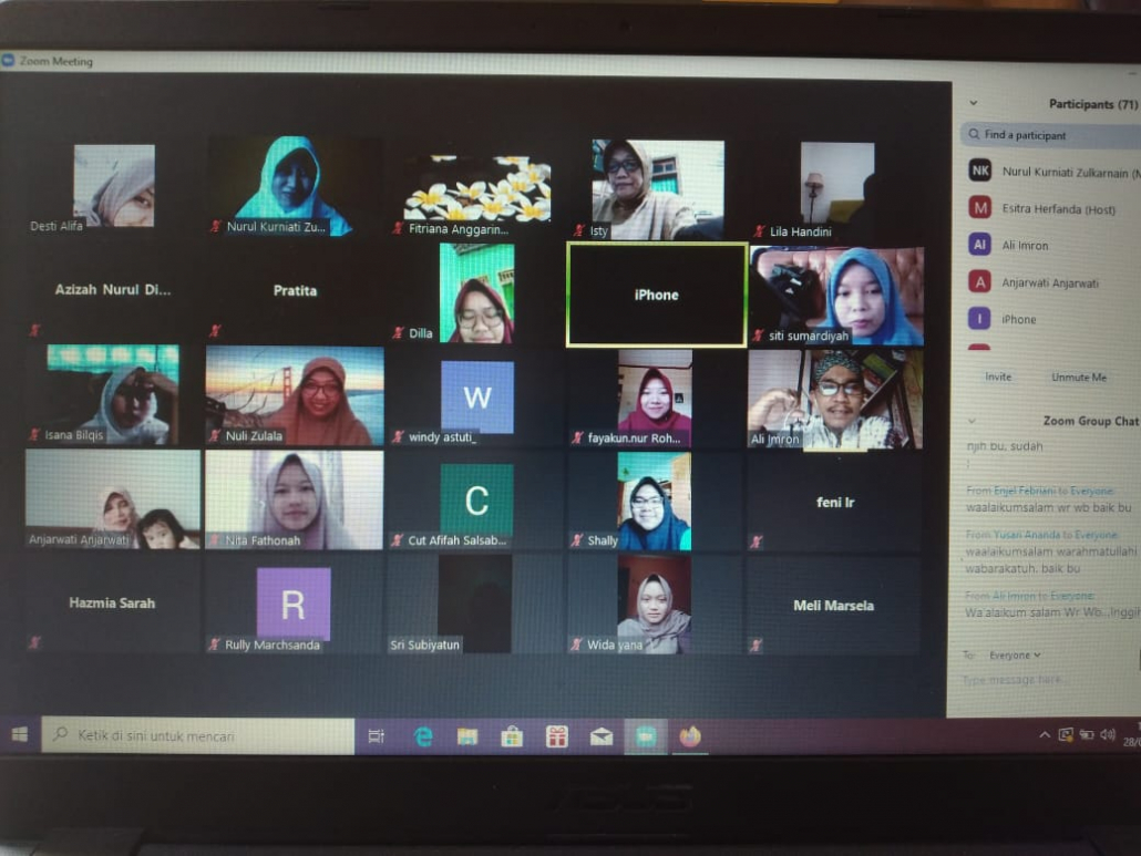 Kepala Prodi D3 Kebidanan Unisa Yogya Nurul Kurniati, S.ST., M.Keb dalam sambutanya mengucapkan selamat hari raya Idul Fitri 1441 H mohon maaf lahir batin taqobbalallohu minna waminkum taqobbal ya kariim kepada semua civitas yang mengikuti Syawalan Online.
