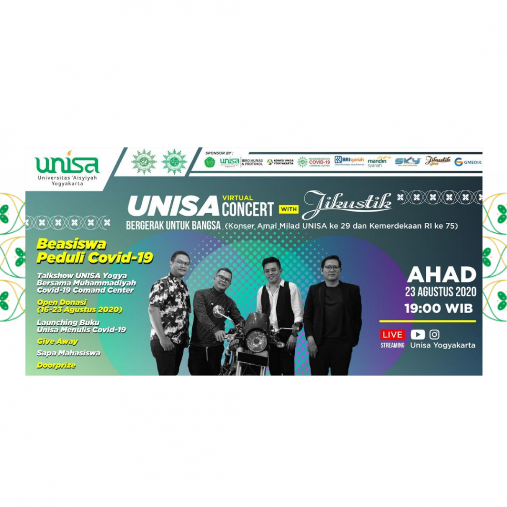 Memperingati Milad UNISA Yogya ke-29 dan Hari Kemerdekaan RI ke-75, Universitas ‘Aisyiyah (UNISA) Yogyakarta akan menggelar konser virtual bersama grup band Jikustik dengan tema “UNISA Bergerak untuk Bangsa” dalam acara Jikustik Show, Ahad (23/07).