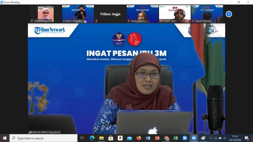 Acara yang digelar hari Senin (19/10), via aplikasi telecoference tersebut menghadirkan narasumber Baskara Aji selaku Sekretaris Gugus Tugas Penanganan Covid-19 DIY dan Warsiti,S.Kp.,M.Kep.,Sp.Mat., selaku Rektor Universitas ‘Aisyiyah (UNISA) Yogyakarta. Dihadiri juga oleh Universitas Mercu Buana Yogyakarta (UMBY), Sekolah Tinggi Seni Rupa dan Design (STSRD), dan beberapa perguruan tinggi lainnya.