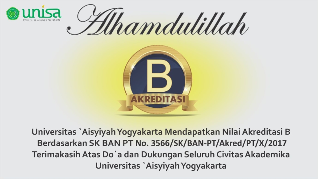 Universitas ‘Aisyiyah (UNISA) Yogyakarta berhasil meraih nilai B dalam akreditasi Badan Akreditasi Nasional Perguruan Tinggi (BAN PT). Hasil tersebut sesuai dengan keputusan yang dikeluarkan BAN PT nomor: 3566/SK/BAN-PT/Akred/PT/X/2017.