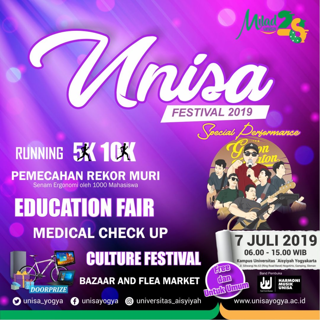 Unisa Festival 2019 merupakan rangkaian Milad Universitas `Aisyiyah Yogyakarta ke- 28 akan digelar di Halaman kampus Unisa Yogya, Minggu (7/7) mendatang.
