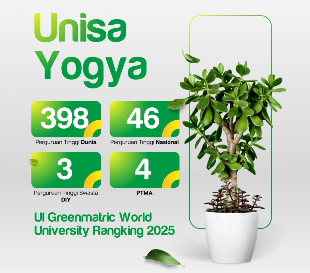 Universitas ‘Aisyiyah (UNISA) Yogyakarta kembali menorehkan prestasi di tingkat nasional dan internasional dengan meraih peringkat 398 dunia dalam UI GreenMetric World University Ranking 2025. Capaian ini menempatkan UNISA Yogyakarta pada peringkat 46 nasional, peringkat 3 perguruan tinggi swasta di DIY, serta peringkat 4 Perguruan Tinggi Muhammadiyah dan ‘Aisyiyah (PTMA).